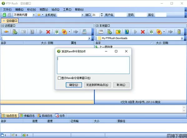 5、有时候我们会利用它来上传一些文件,但如果上传的文件很大,我们就想知道该FTP还有剩余多少空间,以便做好相应的准备,其实我们只需要登录该FTP之后,按下“Ctrl+R”键,在弹出的“发送Raw命令到站台”窗口中输入“ALLO 1”,并勾选“显示Raw命令结果窗口”一项,单击“确定”即可,结果数据以字节为单位,扣除最后6位数字,即可知道该FTP空间大概剩余多少兆了,如下图所示: