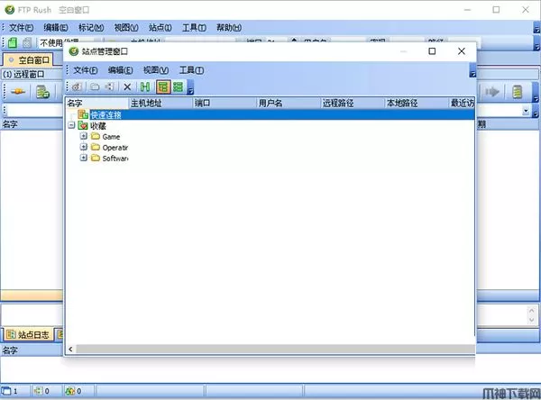 6、在FTPRush将快速连接中的站点添加到站点管理器比较麻烦,不像CuteFTP那样提供了一个直接添加的按钮,我们需要按下F3打开站点管理器,接下来展开“历史”一项,这里保存了所有快速连接中的站点,选中要保存的站点后,用鼠标将其拖曳到“收藏”项中即可