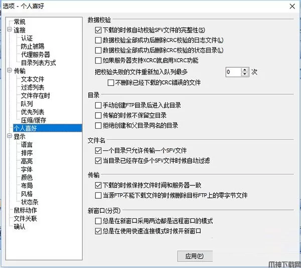 7、由于软件在下载文件之前会首先建立一些以下载文件名命名,并加上后缀“.missing”的文件。有时候下载可能会中断或者被我们手动停止,这样一来硬盘中就残留了很多无用的文件,如何避免这样情况的发生呢?只需在程序中选择“工具→选项”按钮打开软件设置窗口,切换到“个人喜好”标签,取消勾选“下载的时候自动校验SFV文件的完整性”一项即可,如下图所示: