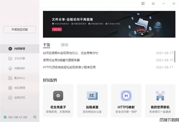 花生壳内网穿透电脑版是全一款强大的动态域名解析软件,其颠覆性的技术创新,无需公网IP,适用各种复杂的网络环境;无需路由器设置端口映射,简化了大量设置流程,支持在客户端上添加端口映射,快速将内网服务发布到外网。