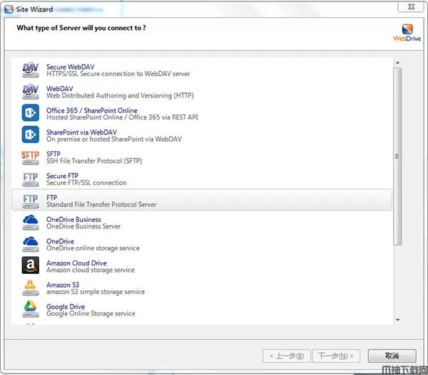 4、选择你要连接的ftp服务器,或者网盘,支持webdav,onedrive,amazon cloud drive,google drive等网盘