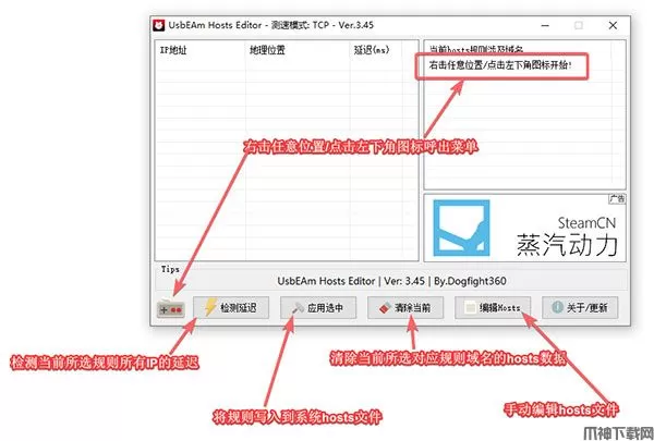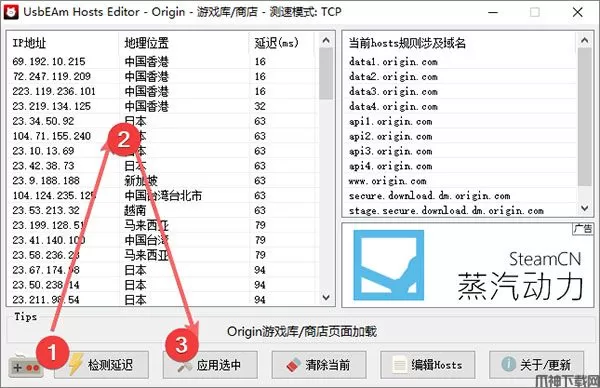 Steam游戏平台有时会因各种原因导致平台卡顿甚至无法访问,但你可以通过这个软件快速找到合适的IP来修改Hosts地址,以便可以加速平台访问以及让游戏下载提速。
