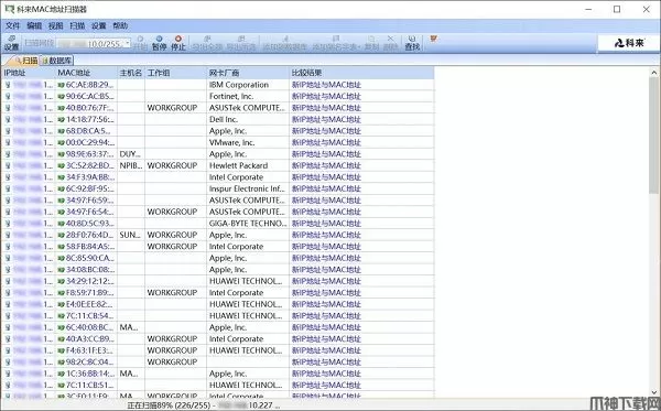 扫描的结果包括IP地址、MAC地址、主机名和网卡厂商。如果扫描结果中存在一个MAC地址对应多个IP地址的情况,物理地址扫描器会自动识别并按照其对应关系正确显示