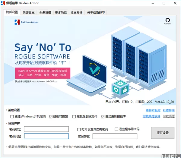 佰盾铠甲(Baidun Armor)是一款永久免费的流氓软件免疫工具,它能够有效地帮助用户一键屏蔽和免疫各种烦人的流氓软件以及弹窗广告。