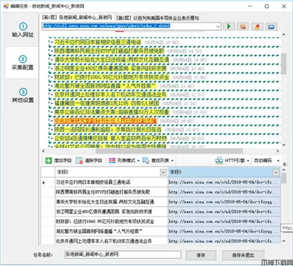 系统会自动生成标题和链接地址字段,并在字段列表中显示出提取到的字段内容,当点击底部表格字段标题时,会在网页上以黄色背景高亮显示出匹配的内容