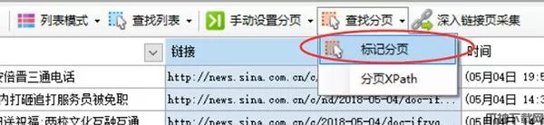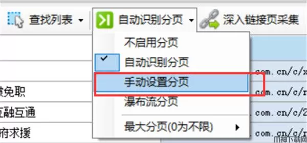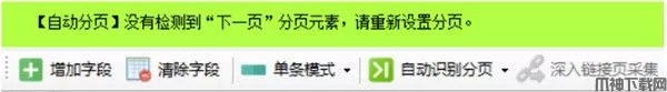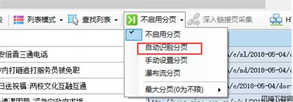 新建任务时默认是没有启用分页的,点击不启用分页,会弹出一个菜单,选择自动识别分页,如果识别成功,会弹出对话框提示成功识别并设置了分页元素,并在网页下一页按钮上出现高亮的红色虚线框,至此成功启用自动分页