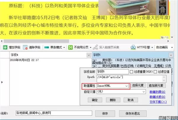 而为了保持原文的段落格式,这里的取值属性可以选择InnerHtml,即该字段提取的数据包含Html标签