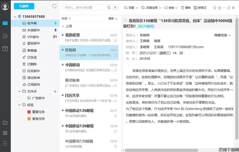 139邮箱电脑客户端是由中国移动通信开发的一款电脑客户端邮箱,很多小伙伴在登录邮箱时总需要打开邮箱网页既浪费时间操作也十分麻烦,今天给您带来的这款139客户端能够轻松帮您解决这样的麻烦,点击客户端即可轻松登录!139邮箱电脑客户端软件拥有简洁实用的外观,不但能够支持多账号管理、支持服务端同步,邮件、日历、通讯录等,同时支持POP3、IMAP、SMTP等收发协议等,用户使用手机号即可登陆,让用户可以更轻松的收发邮件,给你商务极速体验。喜欢的小伙伴不要错过哦!