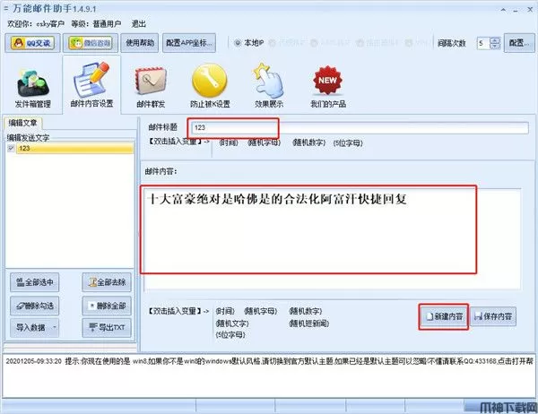 3、在邮件内容设置界面,可以录入需要发送的内容,测试版每次测试,会加入我们的广告信息,付费版中没有广告