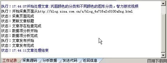 该栏记录ET的每一步工作过程及状态,包括目录采集和文章处理两大部分,我们通过工作记录可以了解该次采集执行是否正确完成,或是出现了什么问题;当出现问题时,可以根据提示、结合信息栏的其他反馈内容,用户可以迅速准确地找到故障原因并予解决。