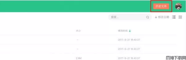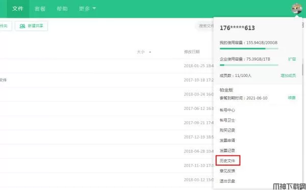 1、打开下载好的好360云盘软件,打开软件后点击右上角的头像,在弹出的选项中点击“历史文件”选项。