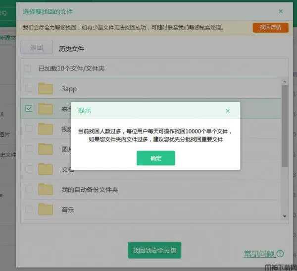 3、然后会提示您“当前找回人数过多,每位用户每天可操作找回10000个单位文件,如果您文件夹过多,建议您优先分批找回重要文件”,点击【确定】就可以了。