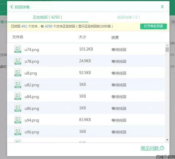 5、打开【找回详情】后,您可以点击【打开所在目录】就可以查看找回的文件保存目录了。