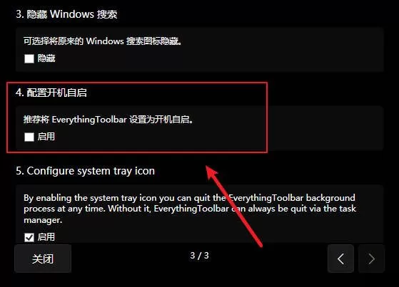 2、在配置中,勾选开机启动:同时勾选将原WIN搜索图标隐藏。