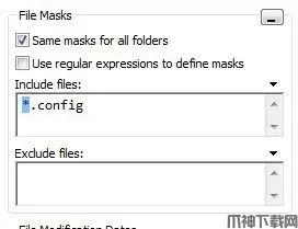 3、然后再进入到Files Masks工作框,填写需要查找的文件类型,或者哪些类型的文件不查找。默认是查找所有的文件类型。此处我只查找*.config类型的文件。