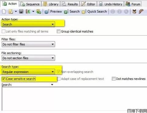 4、进入到右边的操作框,选择需要执行的动作。可以是查找,也可以是替换或者备份等。选择查找,忽略大小写,使用正则表达式匹配。