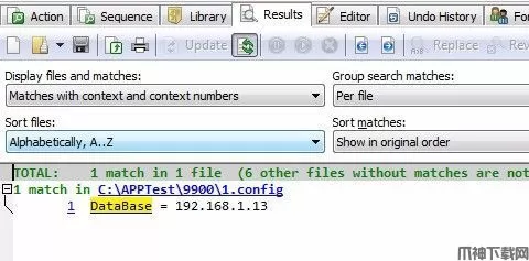 6、然后点击search.在result页面下,就可以显示出指定的范围,指定的文件类型中,所有包括DataBase关键字的文件并且指出具体的位置。