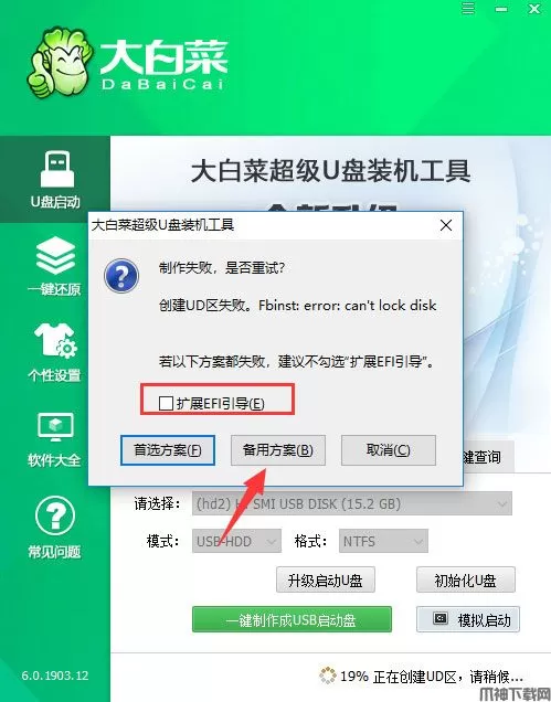 3、若出现制作失败的情况,可以尝试“首选方案”或者使用“备用方案”再次进行制作尝试
