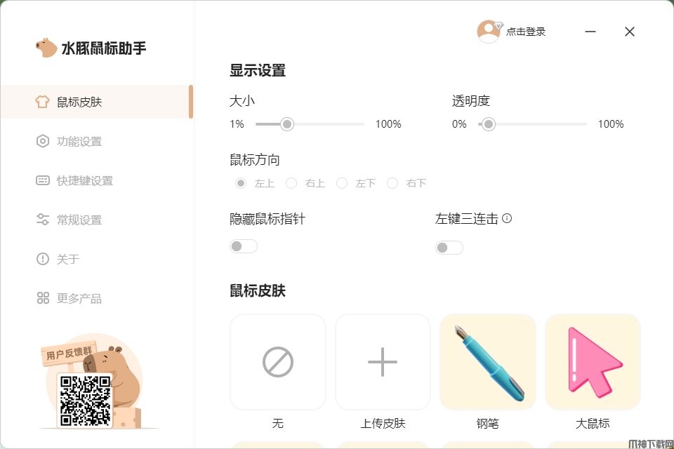 水豚鼠标助手官方版是一款功能强大的屏幕演示工具,它具有鼠标换肤、屏幕画笔、放大镜、聚光灯、屏幕放大和倒计时等功能,通过这些功能你不仅可以根据自己的喜好和需求更换鼠标光标样式,而且还能使用画笔在屏幕上进行涂鸦、标注或者写字,非常适合在演示或者讲解过程中进行标记和说明!有需要的用户欢迎下载使用。
