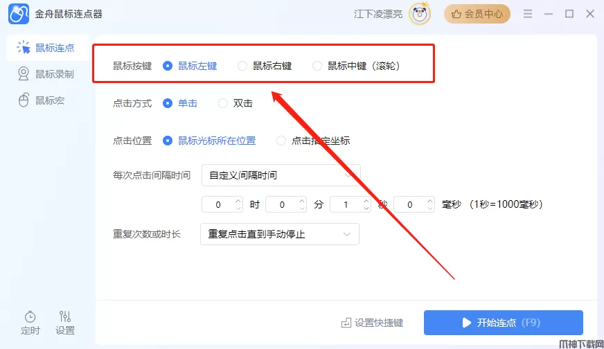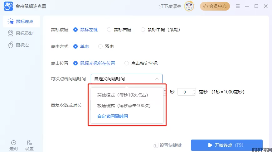 4、设置每次点击间隔时间,软件提供了两种模式,且每种模式对应的点击次数不一样;也可以根据需要自定义设置间隔时间;