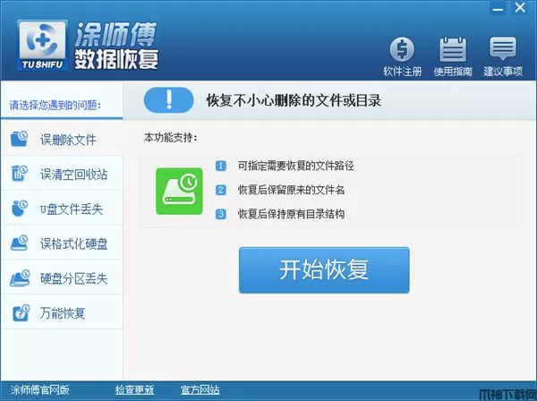 涂师傅数据恢复是一款功能全面、操作简便的数据恢复软件,它集成了六大核心恢复功能,包括万能恢复、误删除文件恢复、误格式化硬盘恢复、U盘/手机卡/相机卡恢复、误清空回收站恢复以及硬盘分区消失恢复。涂师傅数据恢复软件广泛支持硬盘、U盘、手机、各类存储卡、数码相机等多种设备的数据复原,能够应对文件误删、格式化、分区丢失、回收站清空、RAW格式损坏、误Ghost操作乃至文件名异常等多种数据丢失场景,覆盖日常使用中的绝大多数恢复需求。
