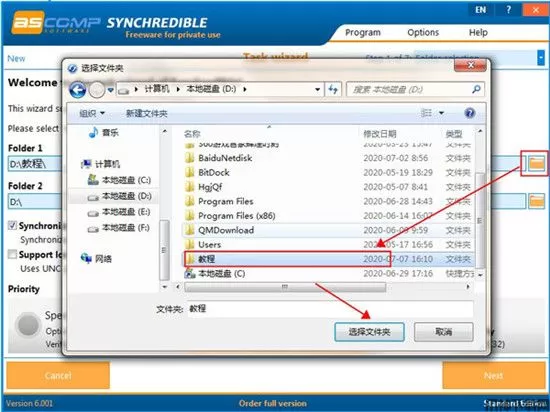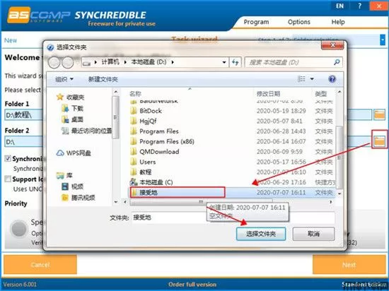 1、小编这一次就给大家演示一下怎么使用Synchredible将电脑中的文件夹同步到另一个文件夹中吧。首先设置文件夹1的文件夹路径。点击文件夹1路径右边的文件夹按钮,在文件夹浏览窗口中点击选择想要备份的文件夹,然后点击确定