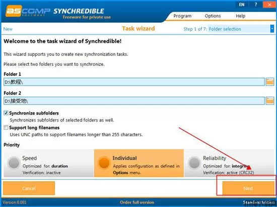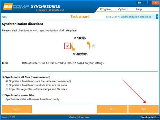 4、勾选选择文件夹1备份到文件夹2,然后点击Next