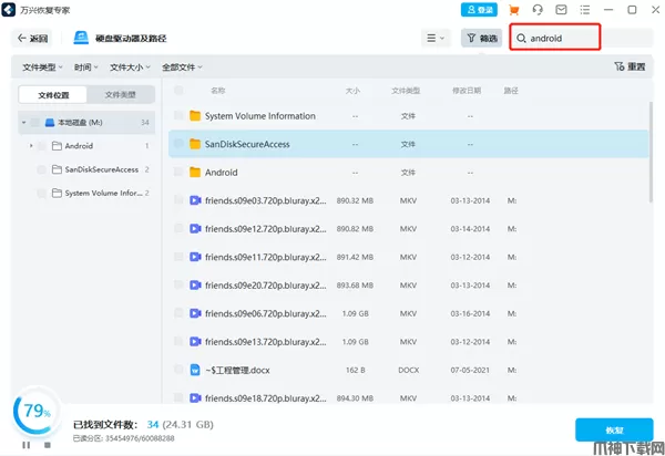 4、此外,您还可以直接在右上角的框中搜索关键字。然后万兴恢复专家将识别所有引用关键字的文件。