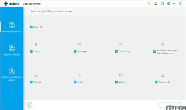手机连接成功后,Android的dr.fone将显示其支持的所有数据类型以进行恢复。默认情况下,它已检查所有文件类型。您只需选择要恢复的数据类型即可。
