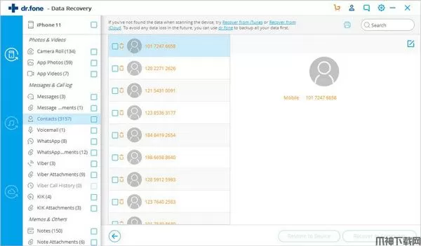 当您找到所需的数据时,只需在复选框前面打勾以选中它们。然后,单击窗口右下方的“恢复”按钮。默认情况下,恢复的数据将保存到您的计算机。至于文本消息,iMessage,联系人或便笺,当您单击“恢复”时,将弹出一个窗口,要求您“恢复到计算机”或“恢复到设备”。如果要将这些消息放回iOS设备,请单击“恢复到设备”。