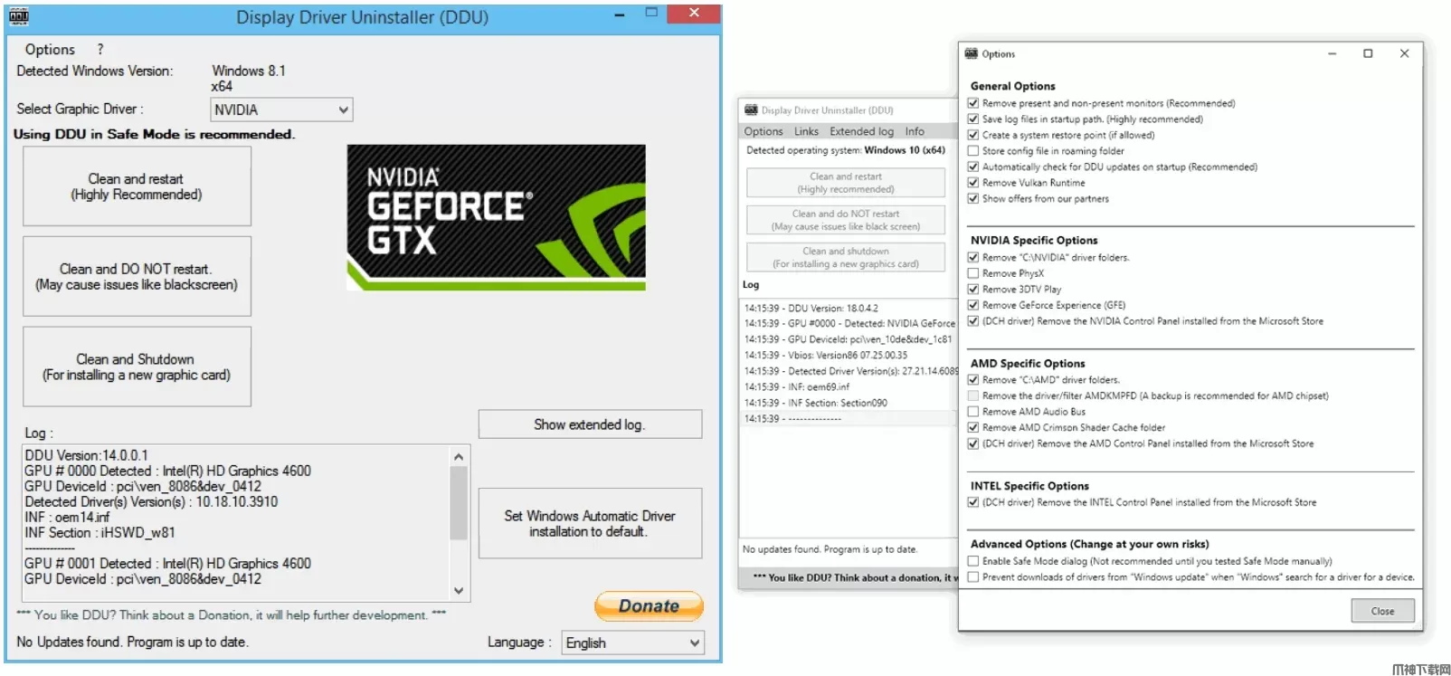Display Driver Uninstaller是一款专门用来卸载显卡驱动的软件,它可以让用户不用通过控制面板就可以卸载选择的显卡驱动,而且驱动卸载的非常干净,不会影响用户安装新的显卡驱动。显卡驱动是电脑上非常重要的一个驱动,如果这个出问题的话,显卡就不会正常进行工作,如果玩游戏的话就会非常卡,画面就像放图片一样一帧一帧的播放,部分用户没有显卡驱动还会出现黑屏的情况,这个时候是没有办法对电脑的显卡驱动进行卸载的。而Display Driver Uninstaller这款软件,除了彻底清除显卡驱动的优点外,还可以在黑屏状态下卸载有问题的驱动。