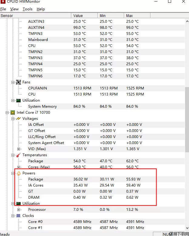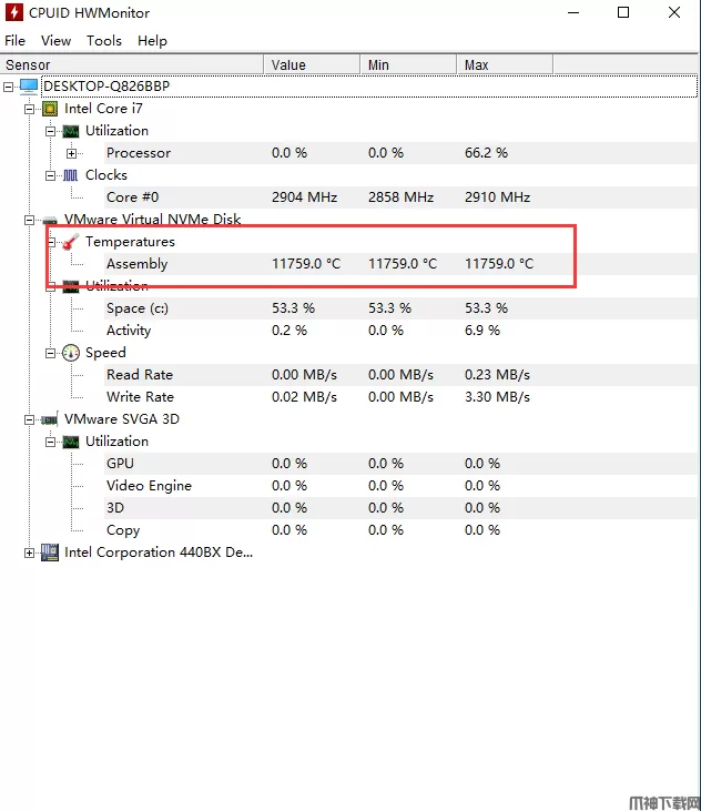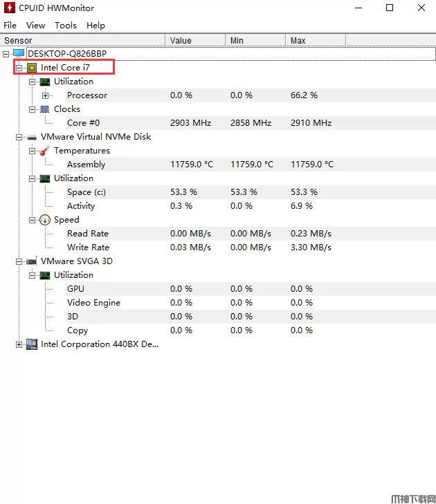 4、通过图示红色一栏可以看到CPU的温度,一般看第一栏Value就可以了,第二、第三栏目是温度波动的最小值与最大值;
