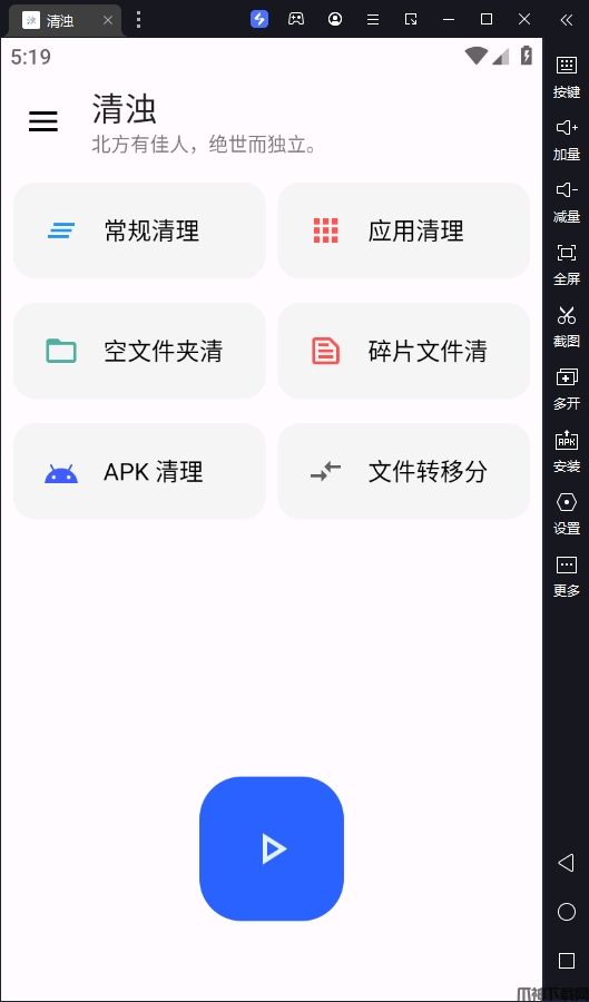清浊电脑版是借助安卓模拟器运行在pc端的一款手机清理工具。它提供了一系列强大的功能,包括常规清理、应用清理、空文件夹清理、碎片文件清理、APK清理和文件转移分类等。大家只需要点击下方的蓝色按钮,软件即可自动分析和扫描本地文件,同样适用于安卓模拟器。总之,清浊让您不再担心存储空间不足,不再忍受应用运行缓慢,手机清理工具将成为你的超能力。