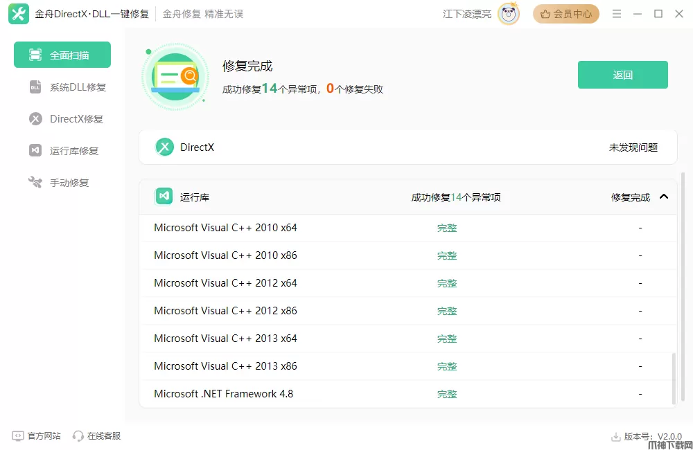 6、如图,刚刚异常的运行库就全部修复完成啦!