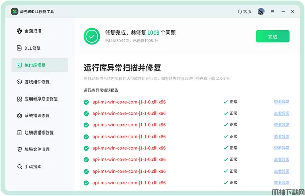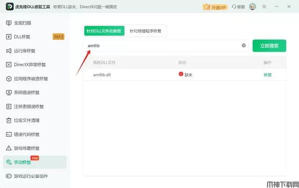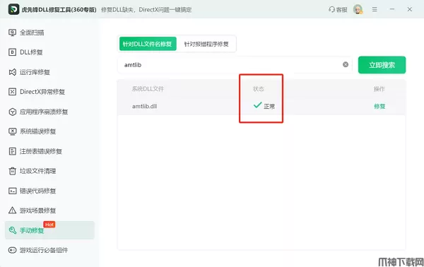 在虎先锋DLL修复软件中,具备【手动修复】功能,找到想要的DLL文件,点击【修复】,即可【修复成功】,这里状态由【缺失】将由变成【正常】。
