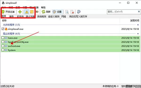 1、下载解压后运行simplewall程序,第一次打开时默认是未启用防火墙的(状态栏的图标是灰色),点一下下面的“未过滤“按钮,启用防火墙;