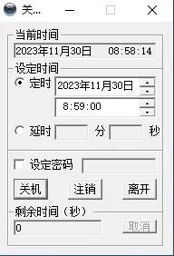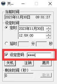 延时关机和定时的区别,就是延时是根据用户设定的时间开始计算,而定时是根据系统时间到点就会执行任务,如果不想别人取消你的任务的话,只要设定一个密码就可以了。