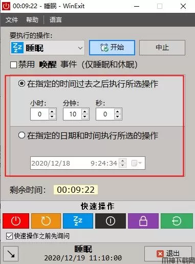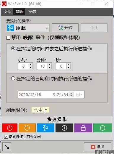 本站为用户提供的WinExit中文绿色版是一款非常实用的辅助工具,可以让您在指定的时间关闭,重新启动,睡眠和休眠计算机的小工具。软件操作简单方便,只要打开软件,设置好时间就可以为你定时完成指定操作了。可以设置自动关机休眠等,时间一到电脑便会自动执行该操作。现在遇到深夜下载资料或者电脑在跑仿真,自己又想早点休息,想电脑在某个时间自动关机,就可以非常简单的解决了。快来下载使用吧!