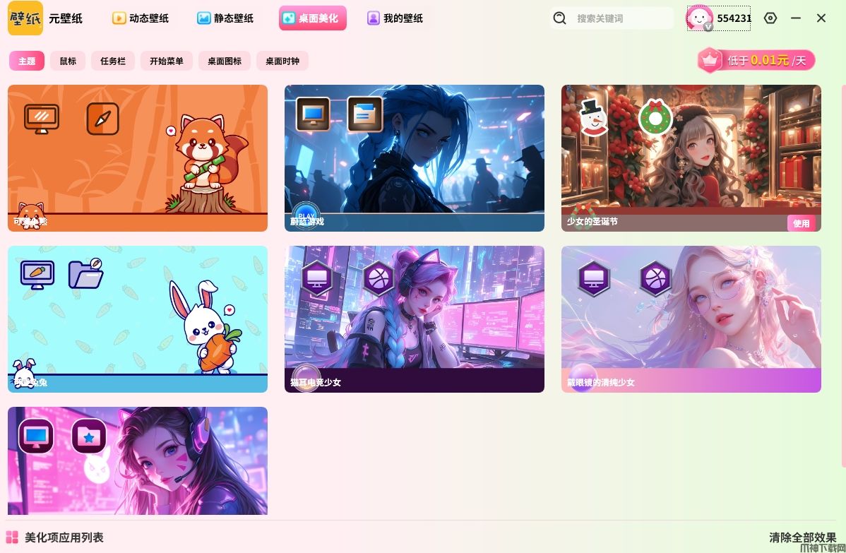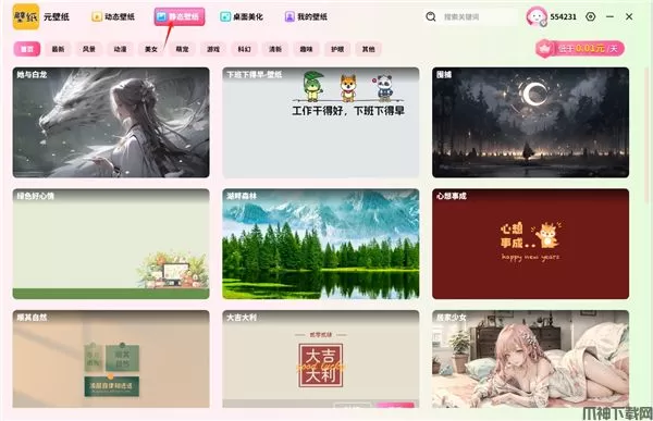元壁纸电脑版是一款动静态桌面壁纸美化工具,它提供海量超清动静态壁纸资源,涵盖动漫、风景、美女、科幻等多种丰富类型,可满足用户各种桌面美化需求。