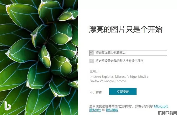 4、虽然该应用程序的整体质量是一流的,但我们不得不提到一个事实,即该应用程序基于“漂亮的图片仅仅是个开始”的营销理念。更确切地说,当您首次安装该应用程序时,它提供了将 Bing 设置为主页的功能,并且使 Bing 成为浏览器上的默认搜索提供程序(无论您使用的是哪种浏览器:Internet Explorer,Microsoft Edge,Firefox 和 Google Chrome)。