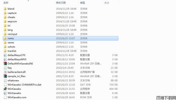 注意图中鼠标所指的文件夹roms,这是放游戏rom的文件夹,没有他你的模拟器中就没有游戏,如果解压后没有roms这个文件夹,那么就自己新建一个。