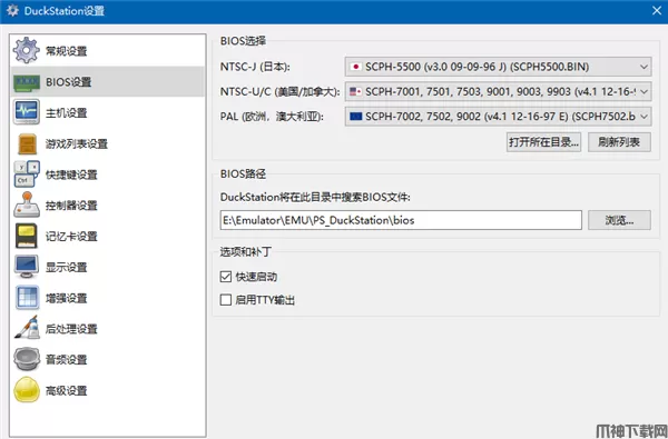 DuckStation可以自动检测BIOS目录中的文件,并可识别官方BIOS,可按照欧版、美版、日版分别设定相应版本的BIOS文件。官方BIOS可以使用快速启动功能跳过开机LOGO显示。如果使用第三方修改的BIOS,快速启动功能会失效。