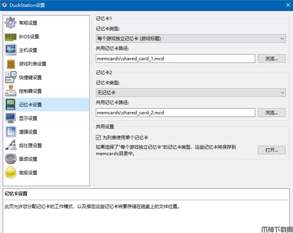 如果勾选了使用单个记忆卡,会根据游戏的ID为每个游戏独立生成一个记忆卡文件,这样就不会出现存储空间不够的情况。记忆卡文件实际上和ePSXe的记忆卡文件是通用的,只需要修改文件名,即可把ePSXe的记忆卡文件转到DuckStation上。