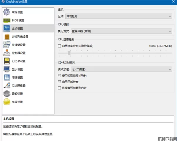 区域检测可是使用自动检测,这样游戏会根据游戏自动启用相应的BIOS。如果运行汉化游戏而使用第三方BIOS,则可以指定区域以运行指定的BIOS。CPU模拟选择重编译器即可,在使用其他增强功能时,模拟器可以自动切换相应的执行方式。