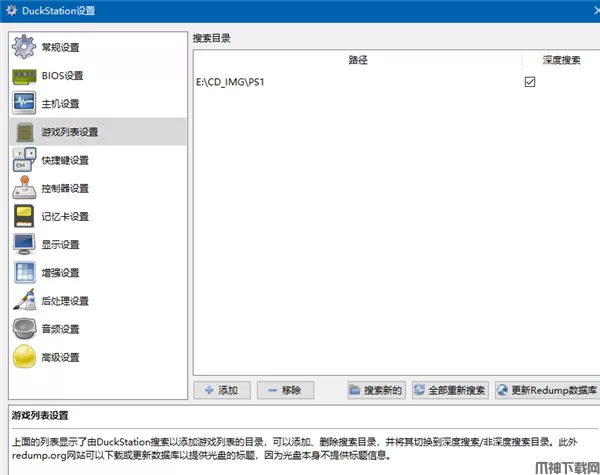 DuckStation指定游戏光盘镜像目录后可以自动搜索目录内的游戏,但只能自动搜索到.img格式的光盘,.bin、.iso等其他格式需要有.cue文件。不在游戏目录内的光盘,可以通过启动光盘按钮直接打开。