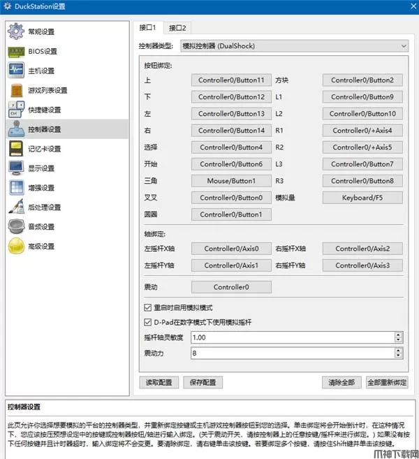 上图是使用XBOX时的配置,其他手柄可参照设置。模拟量实际上是切换手柄模式的快捷键,按下后可以在数字和模拟手柄之间进行切换。早期PS游戏不支持模拟手柄,可以通过快捷键进行切换。