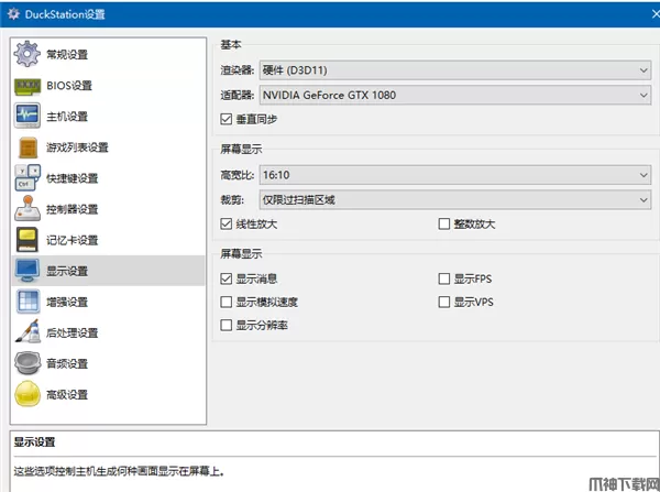 渲染器推荐使用D3D11,速度最快。OpenGL速度较慢,不适合高分辨率,Vulkan在N卡上效果一般。使用16:10的宽高比,并且裁剪掉过扫描区域,可以让一般4:3的PS游戏在现在普遍16:9的屏幕上基本满屏显示且没有明显的变形,仅在左右有一个很窄的黑边。
