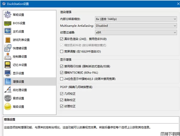 PGXP是DuckStation比较有特色的一项功能。由于PS的机能不足,在处理3D图形时,建模精度和纹理透视都有问题。PGXP是一项HACK功能,提供了更高精度的建模和校正过的纹理,PS游戏的纹理不再扭曲变形,也会令画面抖动问题极大的减轻。