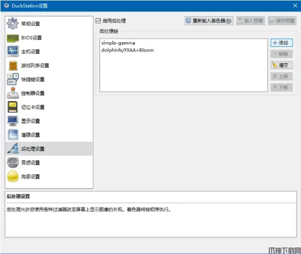 后处理方面由于作者同时是Dolphin的开发者,因此他很取巧的令DuckStation可以直接使用Dolphin的.glsl滤镜,把滤镜文件放入模拟器根目录下目录中,就可以通过添加按钮增加滤镜。