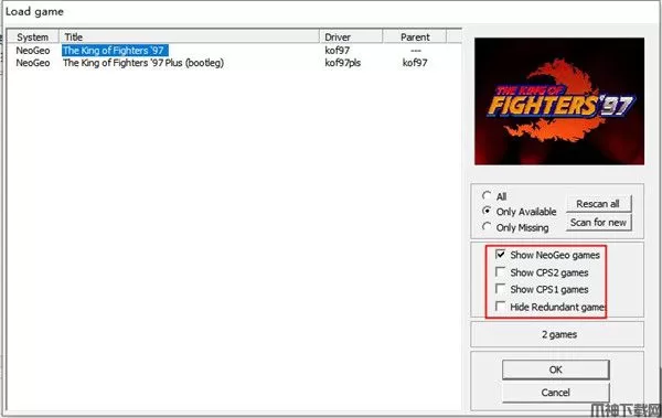 3、勾选Show NeoGeo games,Show CPS2 games,Show CPS1 games和Hide Redundant games;